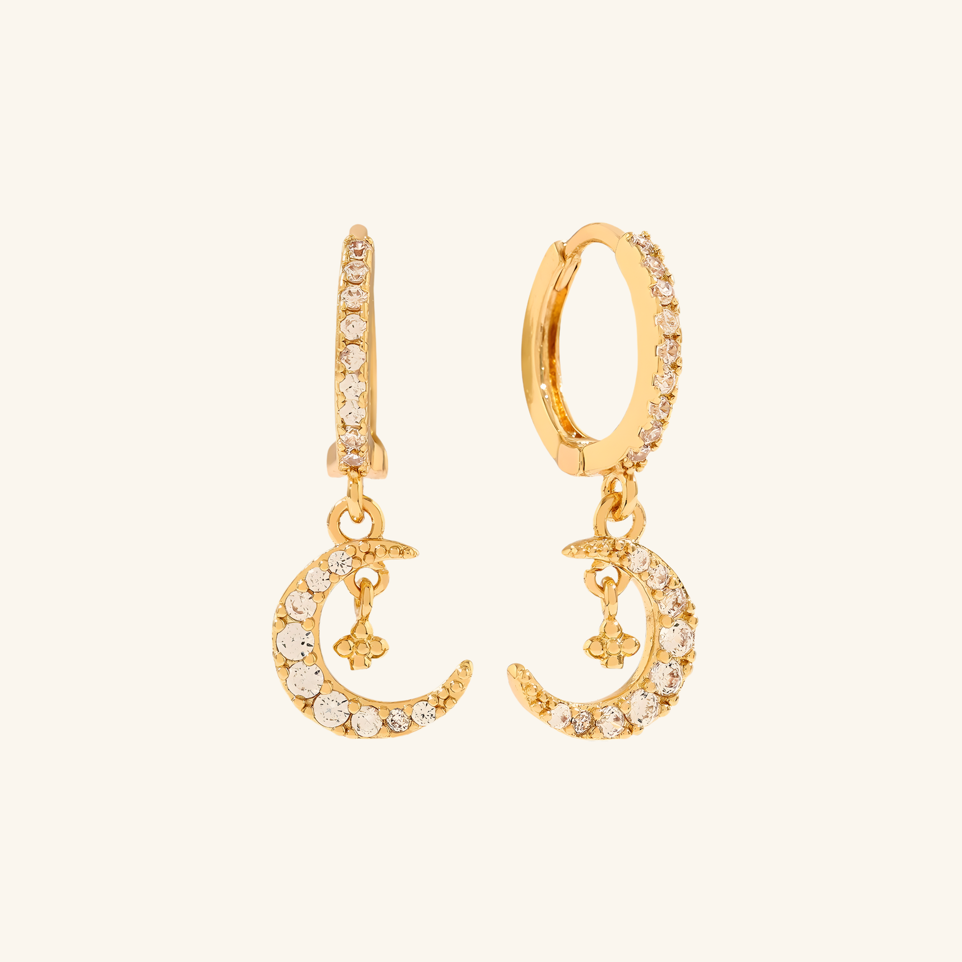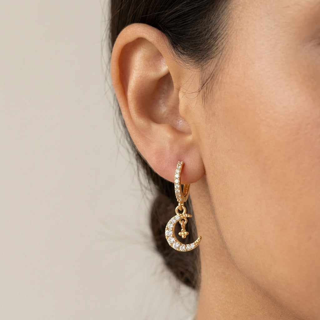 Die 14K vergoldeten Ohrringe NALA werden durch einen halbmondförmigen Anhänger mit funkelnden Zirkonia-Steinen ergänzt. Die Kombination aus klarer Form und feinem Glanz wirkt modern und feminin. Ideal als dezentes Highlight für Tag und Nacht.