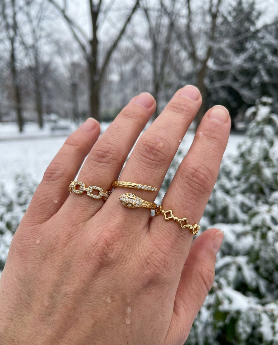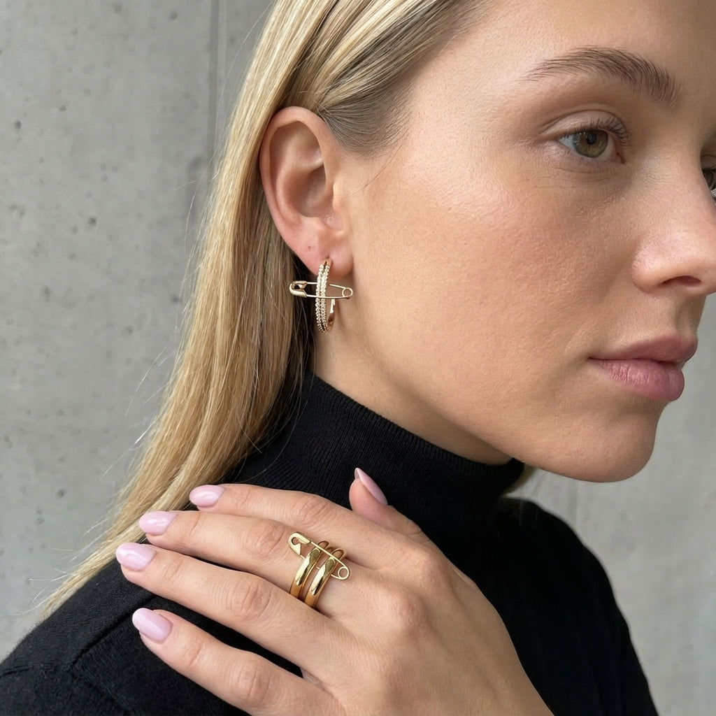 Die doppelte Ringschiene und das markante Sicherheitsnadel-Element verleihen dem 14k vergoldeten Ring CECILE eine moderne, leicht rebellische Note. Klar im Stil, stark in der Wirkung. Perfekt für alle, die schlichte Designs mit einem besonderen Twist schätzen.